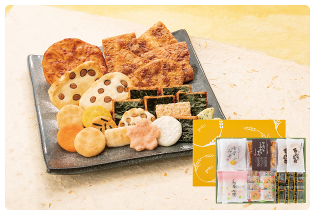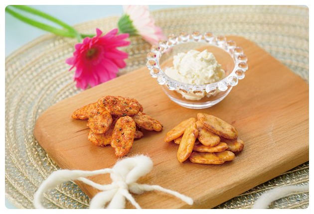 ちょっとプレミアムな逸品をお母さんへ。2種のお煎餅をフロマージュディップをつけてゆったり時間を。真っ白な毛糸をあしらったプレミアム感あふれるパッケージでお届けします。