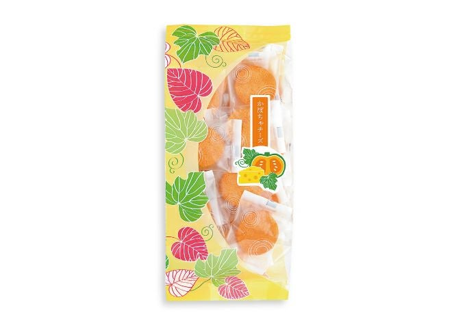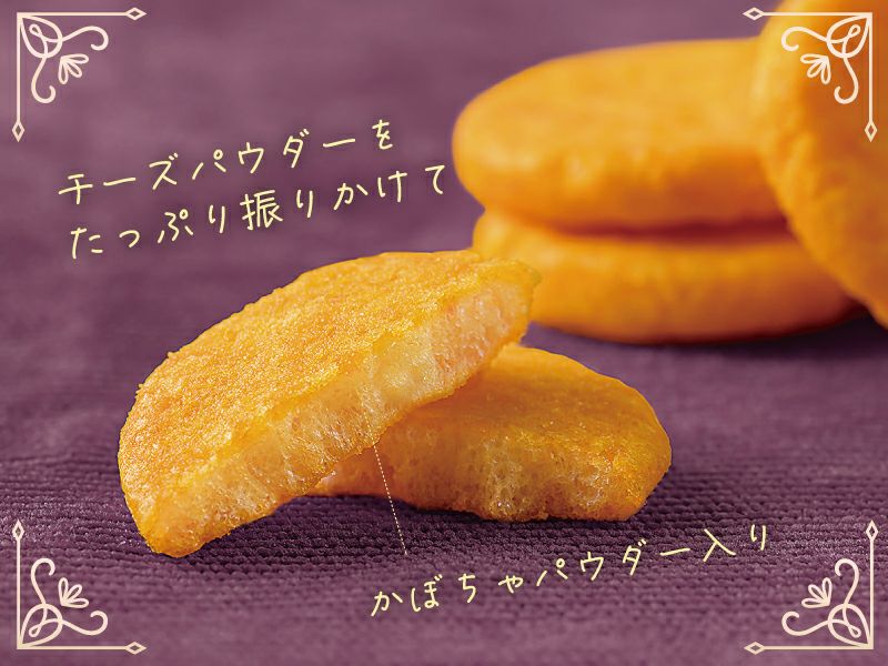 お煎餅の生地にかぼちゃパウダーを練りこみ、さらに濃厚なチーズで味付けしました。ひと口サイズのふっくらおせんべい! 1枚1枚個包装されているから好きなときに好きなだけお召し上がりいただけます。